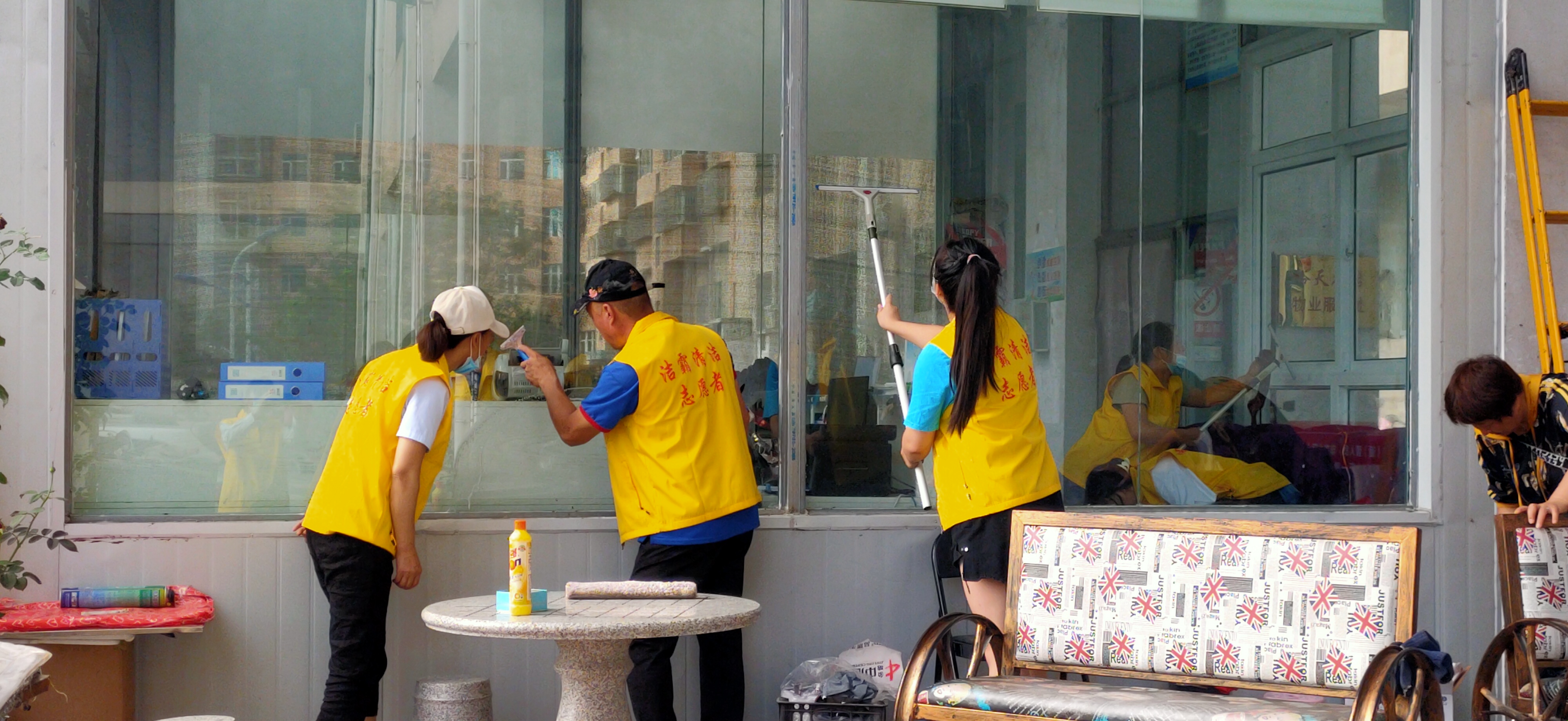 活動現(xiàn)場,志愿者身穿黃色馬甲,自帶玻璃擦、毛巾、笤帚、簸箕等清潔工具,對小區(qū)物業(yè)服務處及小區(qū)環(huán)境進行清潔打掃。他們有的清掃小區(qū)天臺上的垃圾;有的清理樓道門及公共設施上的牛皮癬;有的擦拭門衛(wèi)的玻璃;有的清洗紗窗;有的清洗物業(yè)服務處的玻璃幕墻……志愿者個個干勁十足,不怕臟、不怕累,經(jīng)過一個多小時的團結(jié)協(xié)作,小區(qū)環(huán)境煥然一新。