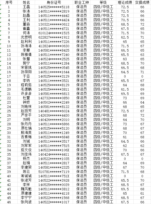 晉城市潔霸清潔服務(wù)股份有限公司職業(yè)技能等級(jí)認(rèn)定中心現(xiàn)將2024年1月21日認(rèn)定人員成績(jī)公示如下: